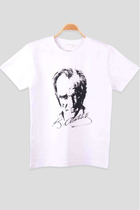 Atatürk ve İmzası Baskılı Yuvarlak Yaka Penye Çocuk Genç Beyaz T-shirt