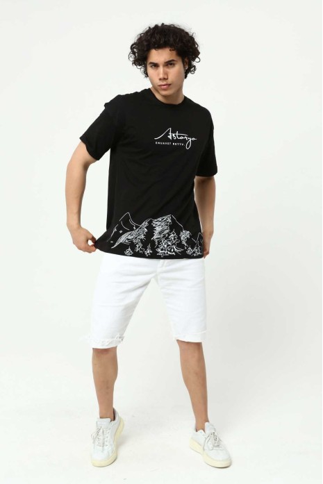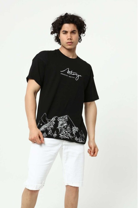 Astanya Baskılı Siyah Erkek Bisiklet Yaka Oversize Kısa Kollu T-Shirt