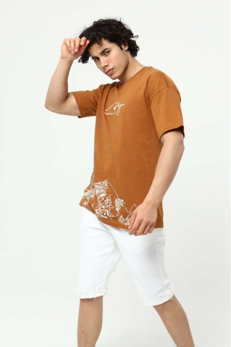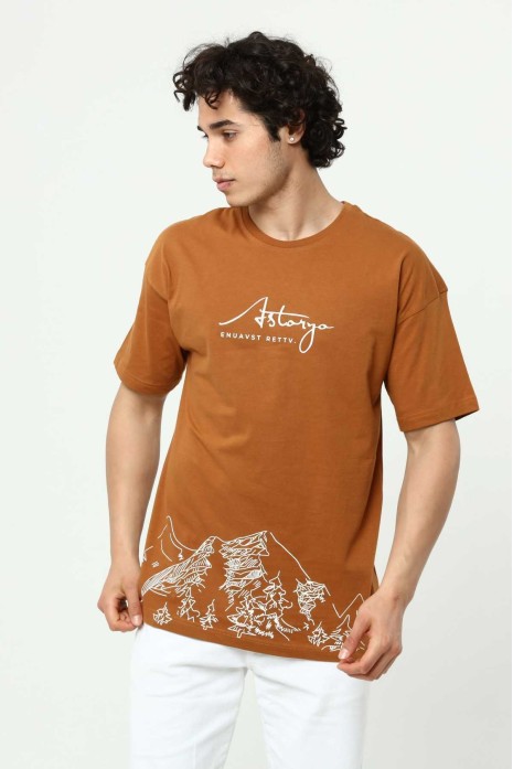 Astanya Baskılı Kahve Erkek Bisiklet Yaka Oversize Kısa Kollu T-Shirt