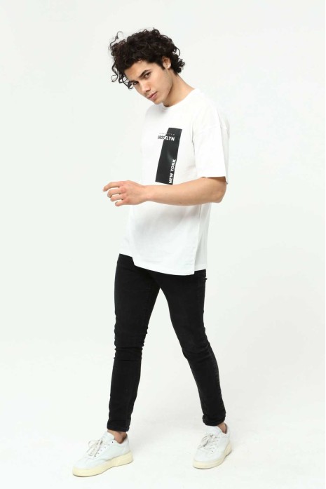 Brooklyn Beyaz Erkek Bisiklet Yaka Oversize Kısa Kollu Baskılı T-Shirt