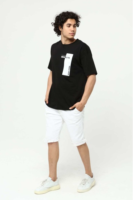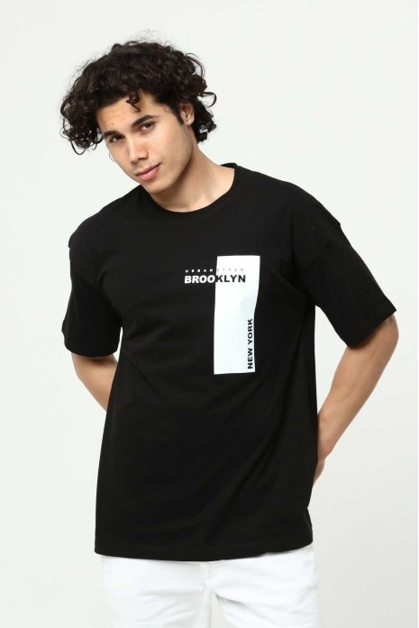 Brooklyn Siyah Erkek Bisiklet Yaka Oversize Kısa Kollu Baskılı T-Shirt