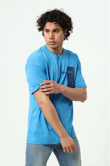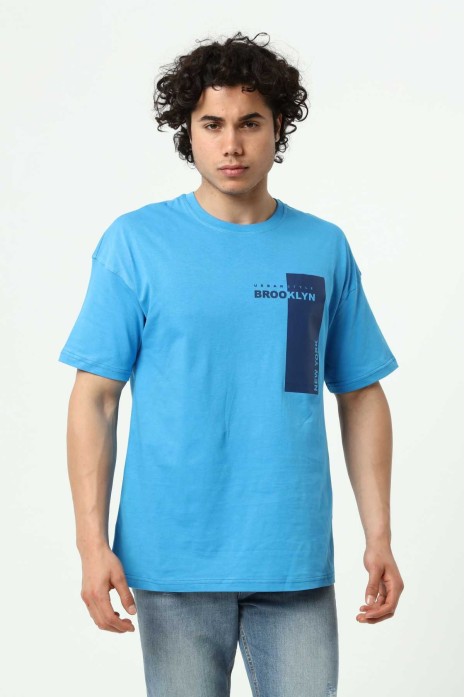 Brooklyn Mavi Erkek Bisiklet Yaka Oversize Kısa Kollu Baskılı T-Shirt