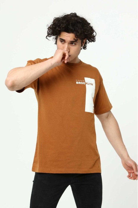 Brooklyn Kahve Erkek Bisiklet Yaka Oversize Kısa Kollu Baskılı T-Shirt