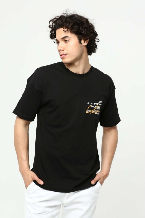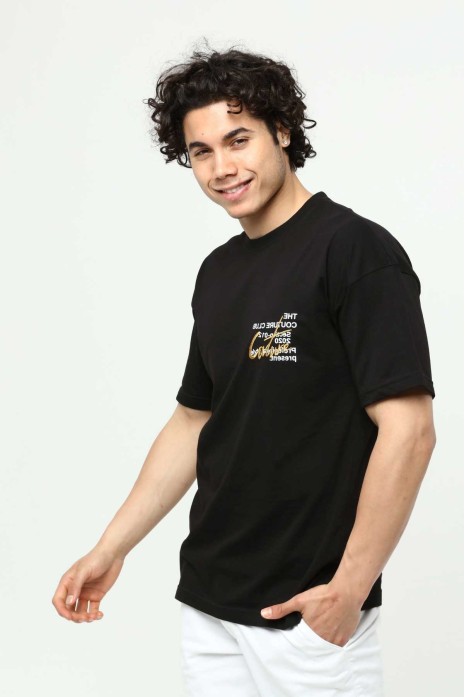 Siyah Erkek Bisiklet Yaka Oversize Kısa Kollu Baskılı Nakış İşlemeli T-Shirt