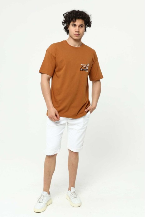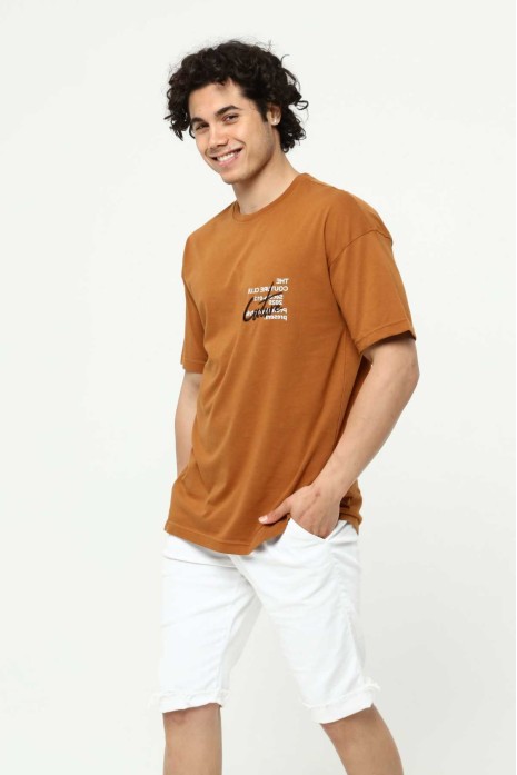 Kahve Erkek Bisiklet Yaka Oversize Kısa Kollu Baskılı Nakış İşlemeli T-Shirt