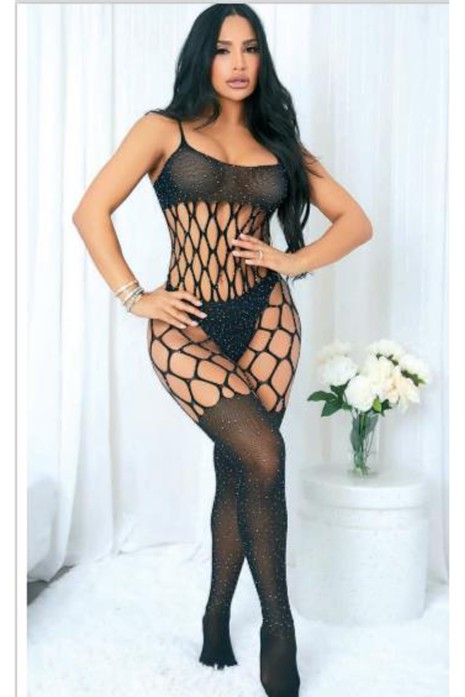 Night Light Kadın Siyah Fantezi File Taşlı Vücut Çorabı 5542