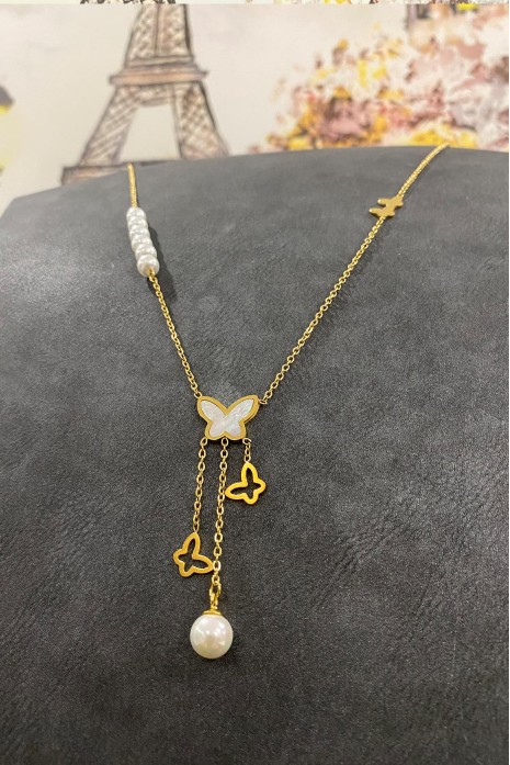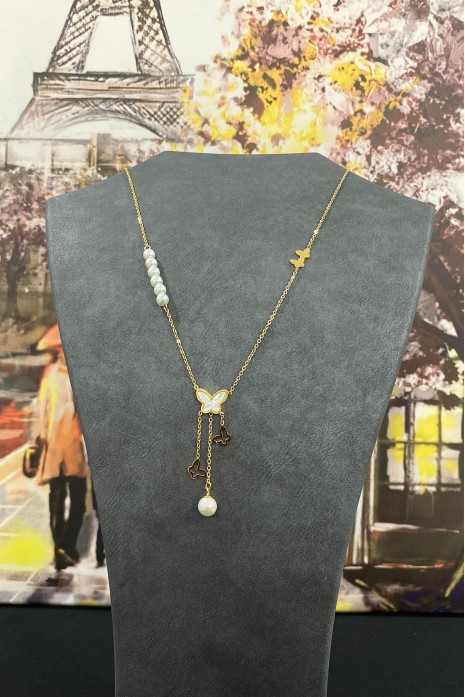 İnci Taş Detaylı Sarkık Kelebek Çelik Kolye 40 cm