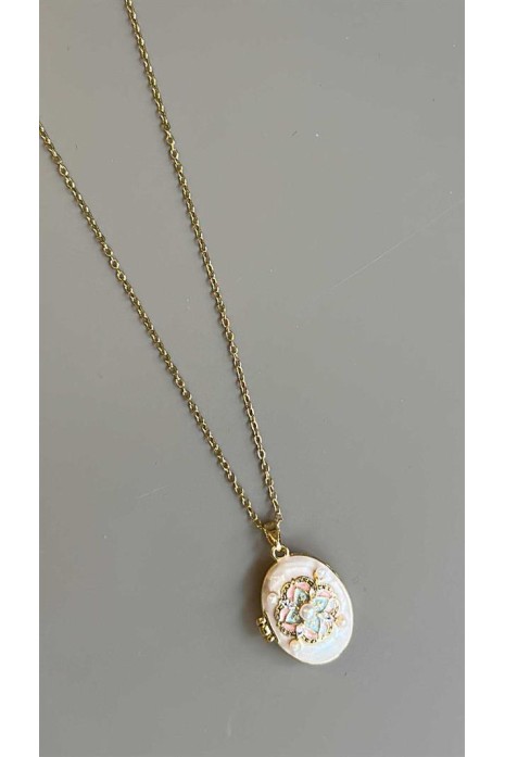 İncili Etnik Desen Kapaklı Kolye - Beyaz